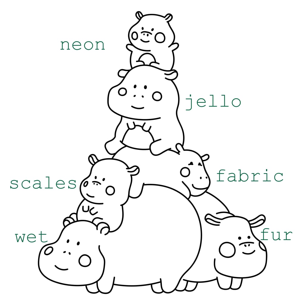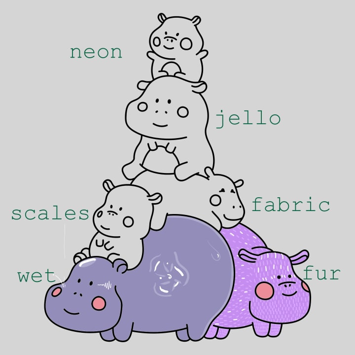 Neon is its own technique and there are two ways to do it. Both require swapping the linework for white and filling the hippo with opaque black. The first method is to select the linework and stroke it in graduating colors. I did two. The other option is to take a neon-type color and manually trace the linework.