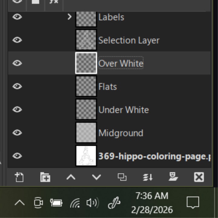 You start by creating a copy of the background. Make sure you have the alpha channel active, select white, and delete the white parts, leaving only linework. Label this "Selection Layer." Next, create a series of transparent layers with the following names: Under White, Over White, Midground, Flats. Over White and Selection Layer are interchangeable in the order.