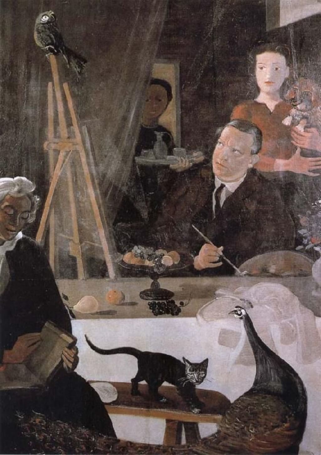 The Painter and his Family is a symbolic artwork that embodies the philosophy of the artist as related to art, particularly in the final decades of his life. (pictured above) During these years in his life he worked in his studio with his family nearby. In the painting, the fruit, the animals, and the family members are the symbolic representations of the idyllic life of an aging artist.