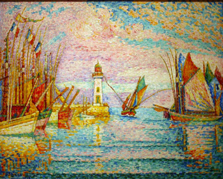 French artist Paul Signac was a well-known artist in the 19th century. This is one of the painter’s most unique lighthouse paintings. It depicts a bright, sunny day along the coast of Groix. Groix is an island in the Brittany region of northwestern France. Ships can be seen on the water with the lighthouse featured in the center of the painting.