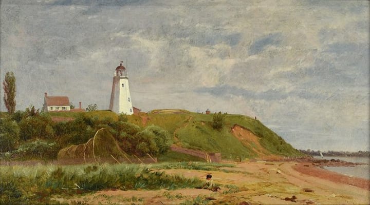 Scottish-American artist William M. Hart was a well-known landscape artist during the early 1800s. This artwork is considered to be one of the greatest lighthouse paintings ever done. It is titled by the location where it is located. The painting depicts a lighthouse atop a hill along the Connecticut coast on a sunny day.