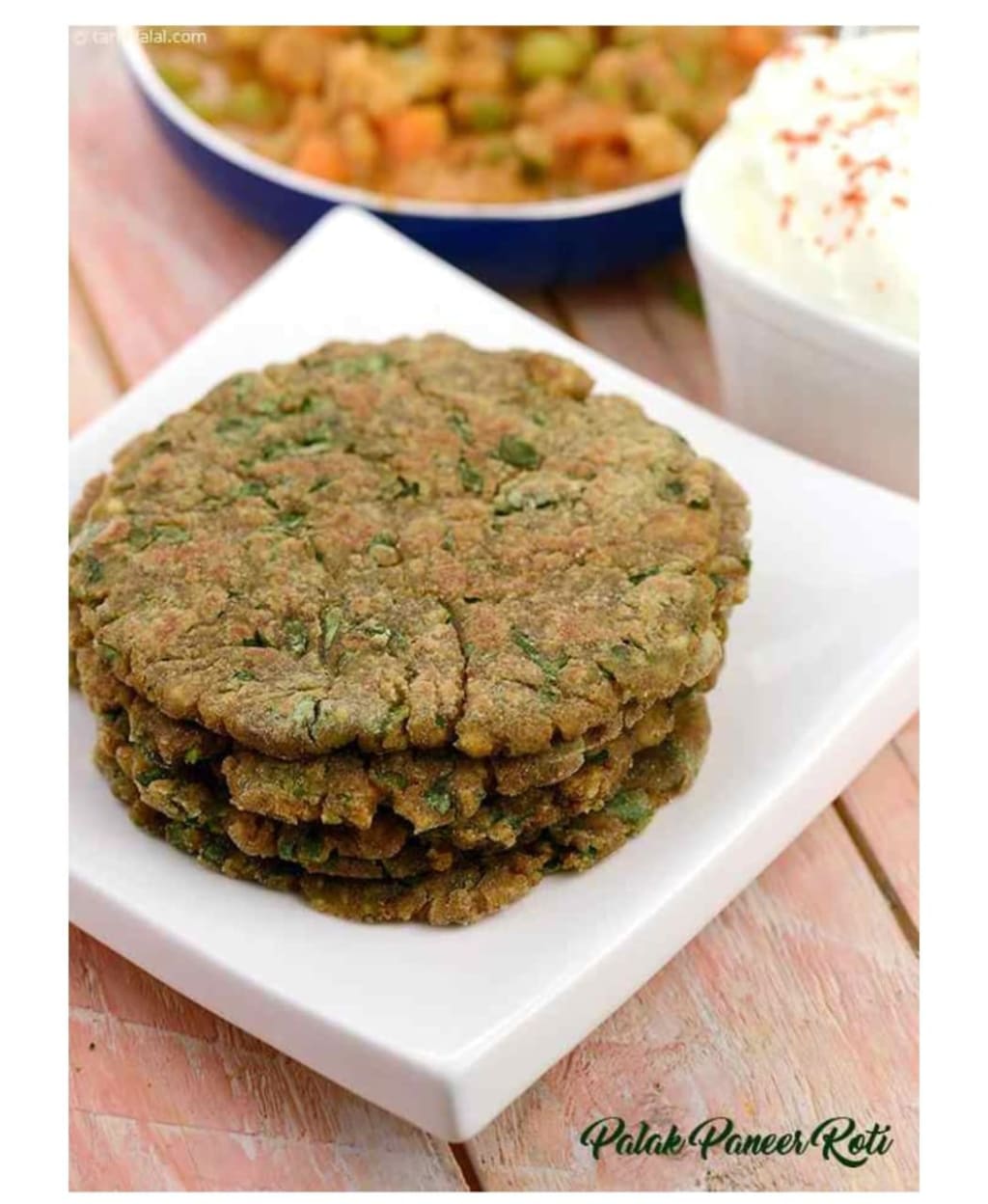 Serve Palak Paneer Roti hot with fresh yogurt.