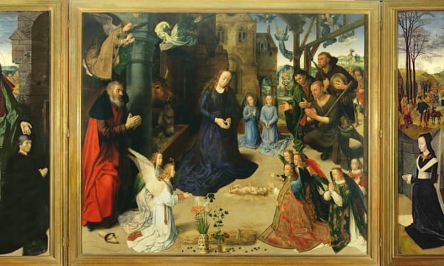 Dutch Artists Portinari Altarpiece Hugo van der Goes Dutch artist Hugo van der Goes created this artwork which became one of the most famous Christmas paintings in history. The artist was known for creating religious scenes and had been commissioned to paint altarpieces. This artwork was done as the altarpiece for the chapel inside the hospital of Santa Maria Nuova in Florence, Italy. Today it can be viewed at the Galleria degli Uffizi in Florence. This painting focuses on the Nativity as well as the Adoration of the Shepherds.