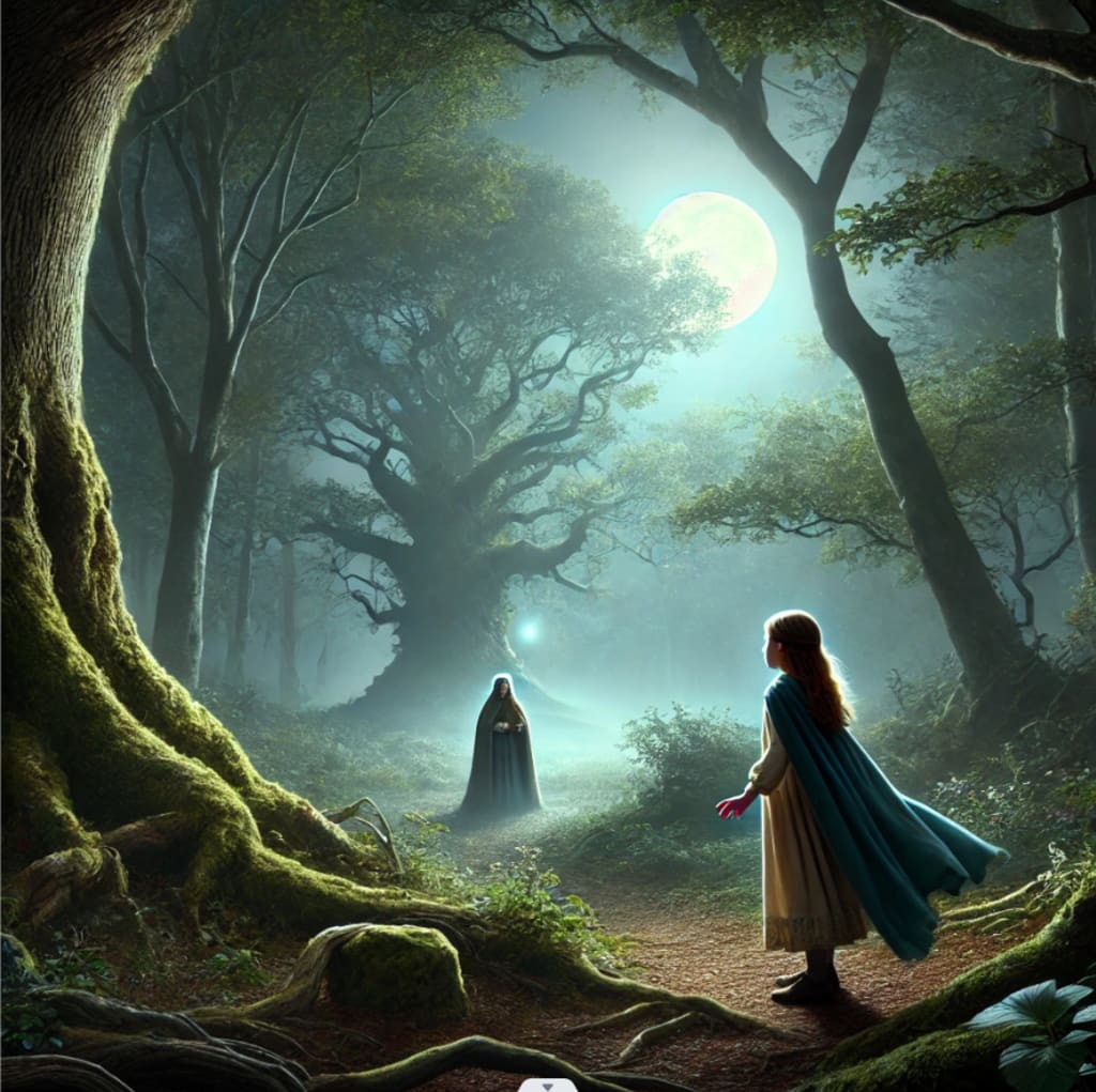 Just as fatigue began to weigh on her, Elowen stumbled upon a clearing bathed in moonlight. At its center stood a towering oak tree, its trunk gnarled and ancient, its roots sprawling like the fingers of a sleeping giant. Beneath its branches, a figure awaited—an old woman wrapped in a cloak of moss and ivy. Her eyes, glowing like embers, fixed on Elowen with an intensity that sent a shiver down the girl’s spine.