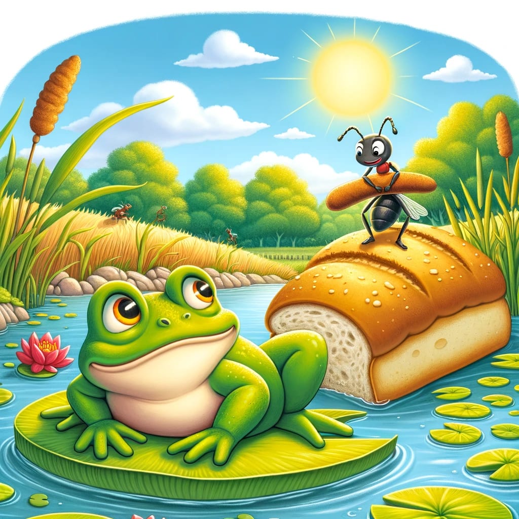 One sunny day, a lazy frog was lying on a lily pad, basking in the warm sun. Suddenly, a busy little ant carrying a giant crumb of bread passed by.