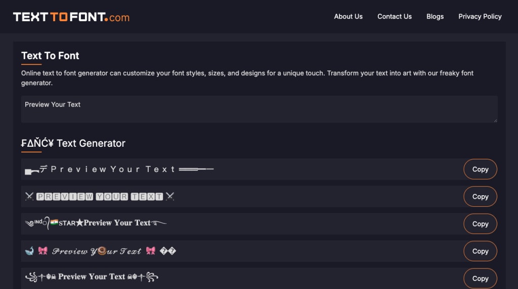 At TexttoFont.com, we make it easy for anyone to turn plain text into something amazing. Whether you want sleek and aesthetic letters or something wild and eye-catching like a freaky font, we’ve got you covered.