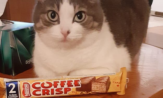 The spoiled human brat, is hissing like a cat. But I won't give it back. ---- A favourite snack of childhood that.... who am I kidding? It's still a favourite snack. Coffee Crisp. One of Canada's most popular chocolate bars. And just for fun, here is an old TV commercial for said snack.