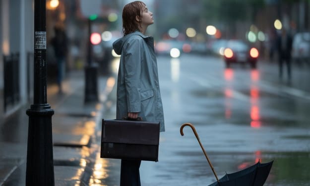 "The Rain and the Stranger". AI-Generated.