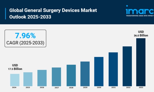 The global general surgery devices market size reached USD 17.5 Billion in 2024. Looking forward, IMARC Group expects the market to reach USD 36.0 Billion by 2033, exhibiting a growth rate (CAGR) of 7.96% during 2025-2033. The increasing prevalence of different surgical conditions, advancements in surgical techniques, and the rising number of ambulatory centers represent some of the key factors driving the market.