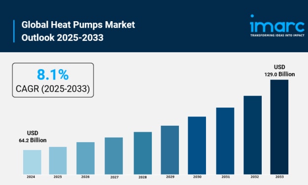 The global heat pumps market size reached USD 64.2 Billion in 2024. Looking forward, IMARC Group expects the market to reach USD 129.0 Billion by 2033, exhibiting a growth rate (CAGR) of 8.1% during 2025-2033.