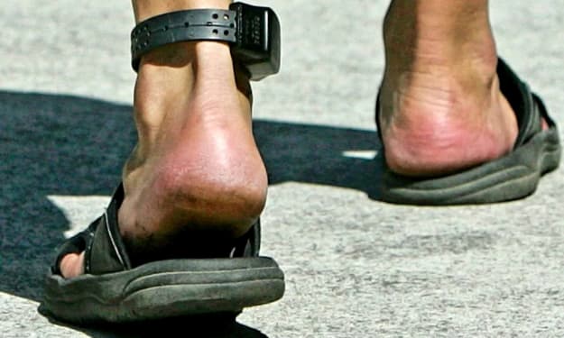 A bracelet, more like an anklet, because freedom was too far stretched. Not the elegant, delicate kind, but a public shaming defined.