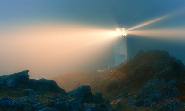 Rocky cliff beacons Through fog, dreams give-way the light Flash of gold, then blue