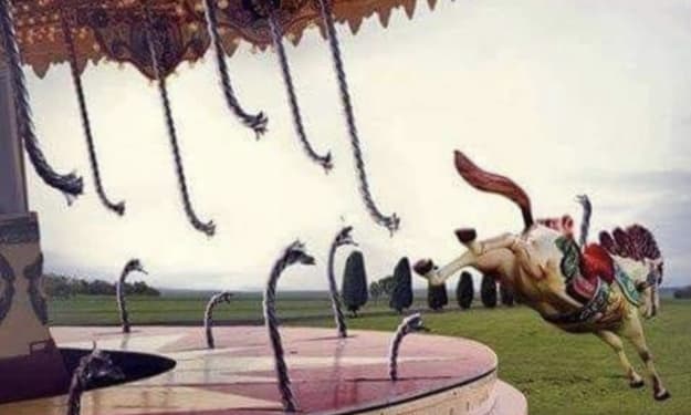She spun in circles, carefree and happy, contently watching as life passed by. One day, she noticed a small pony passing, bold and adventurous. Unkept. She called out a greeting from her stand. The small pony approached her and asked, "why are you spinning around on this carousel, when you could be roaming, wild and free?" She thought for a moment, and then as unpredictable as the wind, she stepped off of her circling pedestal and into her next adventure.