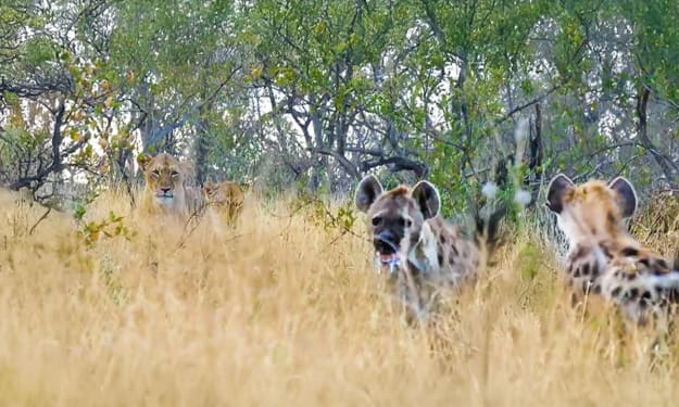 Desperate times call for desperate measures, and this clan of hyenas proved it when they had to make a bold stand to protect their young. In this rare sighting, the clan uses an interesting tactic to try to lure a pride of lions away from their den.