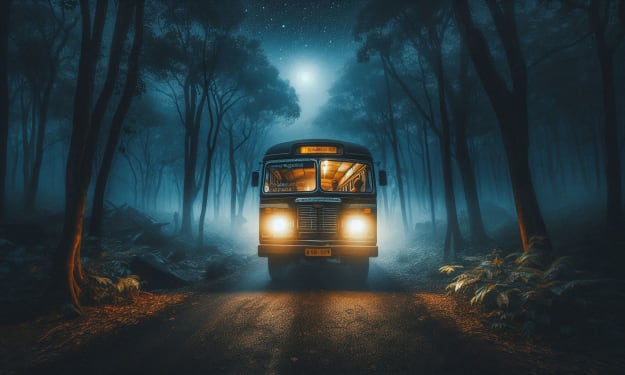 It was a cold winter night, and a thick fog blanketed the deserted forest. A narrow road cut through the silence, stretching into the darkness. The only sound was the hum of an approaching bus, its headlights slicing through the mist as it made its way down the empty road.