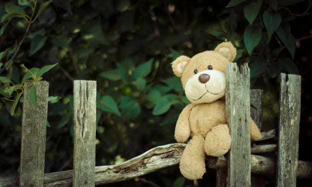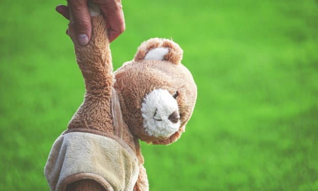 Mommy came a running out of the house and yelled at the thing that had me with its' teeth. The thing dropped me right then and I saw that my leg seemed to have a hole, and I felt funny a few other places too. The mommy and my kid were now going into the house and the mommy was getting ready to do something. I hope whatever doesn't hurt. My kid started to smile a little and mommy said "Mr. Bear should be good as new in a few days and we will check his hurts in a bit."