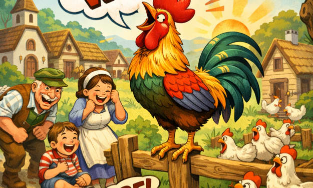 Once upon a time, in a quaint little village surrounded by green fields and winding cobblestone paths, there lived a rooster named Ferdinand. Ferdinand was no ordinary rooster. He had shiny feathers in shades of red, orange, and green that glimmered in the morning sun, and a proud stance that made him look like the king of the barnyard. But Ferdinand had a very unusual problem: every time he tried to crow “cock-a-doodle-doo” at dawn, out came a loud, unexpected “woof-woof!”