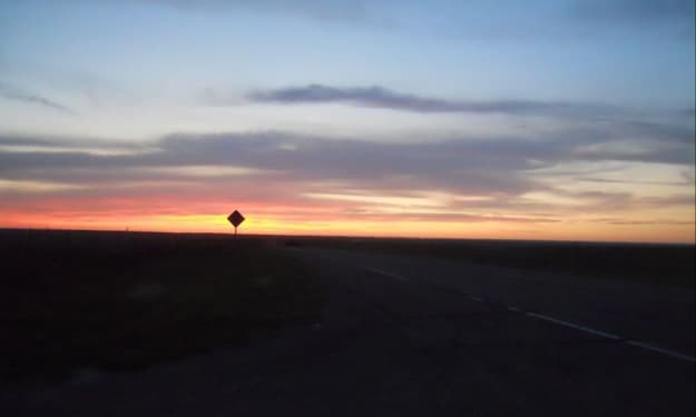 Driving 'cross a land too cold for deer and antelope to play while lavender wraps its way around the endless sky and cattle wade grey