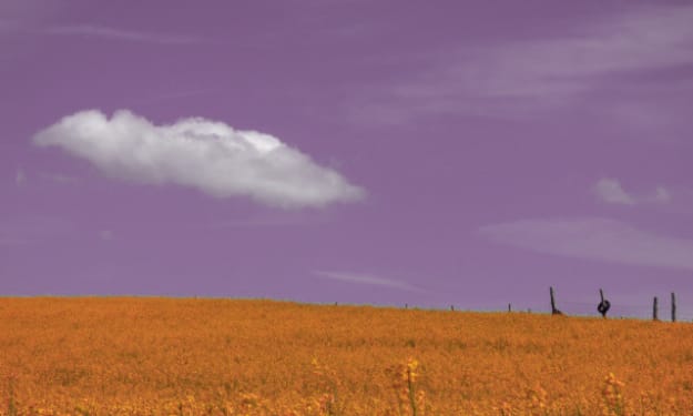 It was April 23rd, and David Aubergine was lost. He had been out walking for eight hours and was at his end, tired and on strange ground. In the distance, black rain clouds loomed, and against the starched gold of the close sun, the afternoon was hot and shallowly backed, the light a veneer over the coming storm. The wind was absent, and the air was heavy with dust, electric and humid. Rolling hills splayed out before him, dotted with forests and bushy undergrowth. Rusted barb-wire fences with leering posts lined the landscape, cutting through wild oats and grasses and the remains of curbs and old lightposts waited, strewn across the fields. Years ago someone had tried developing the land, but had run out of money and abandoned the project. He wondered if he wasn’t trespassing.