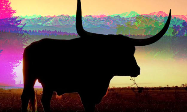 Man trudged across the field, rifle in one hand, a box of shells in the other, going to kill the white bull God had given him. The grass was sodden with dew, leaving dark stains on Man’s boots as he approached the bull, standing in a fairy circle of small mushrooms. The bovine snorted a discontented puff of steamy air into the cool afternoon, twisting its horned head to better watch Man and his rifle. The bull’s large brown eyes appraised him forlornly.