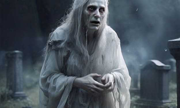 In the depths of a forgotten cemetery, where the moon dipped into the darkness, a lone spirit wandered, shrouded in an aura of eternal sorrow. The wind whispered her name, "Elizabeth," and the trees creaked in mournful harmony.