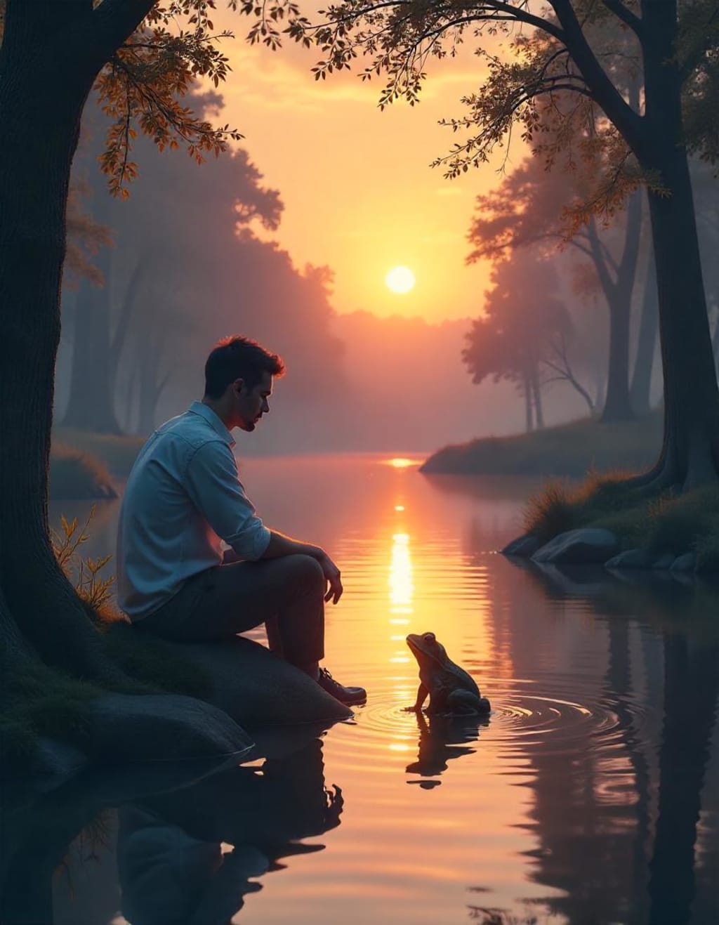 The frog had gone, leaving only the gentle ripples where it had been. The man smiled, a warm feeling spreading through him. Maybe the frog was right. Maybe life wasn’t meant to be so complicated. Maybe it was enough to simply be—to breathe, to feel, to live.