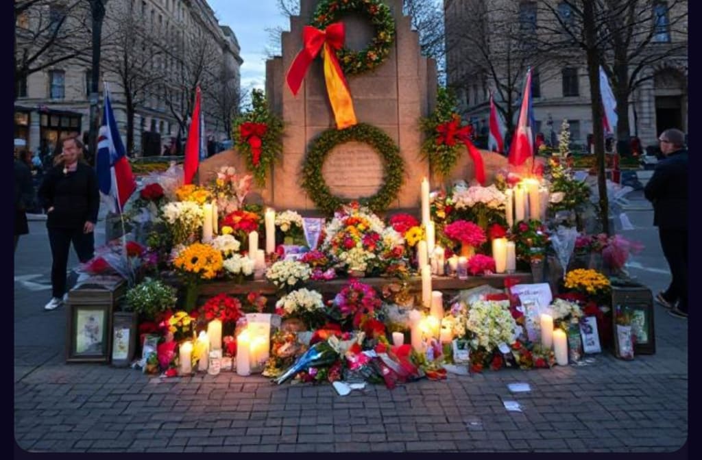 Another candle struggled to stand still. The wavering subsided as a woman picked it up and put it in the path of a doorstop amongst flowers and teddy bears. A dozen people congregated around the makeshift memorial.