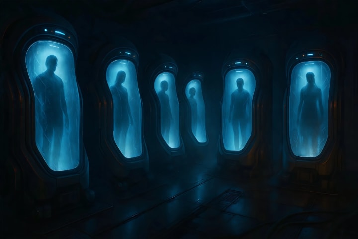 Out among some far-off stars was a movie studio lot, through whose cavernous recesses two other Mini-Flashes were proceeding. They were led by an auburn-haired starlet in a silver dress, who at length drew up before a stasis chamber for one. Like all its kind it was glass-fronted and octagonal, but unlike any of the others nearby, it was occupied.