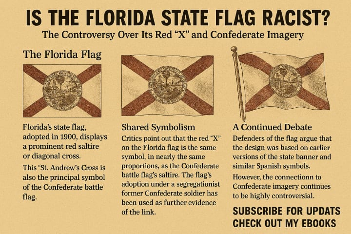 A visual explainer and historical analysis arguing that Florida’s saltire design—added in 1900—duplicates the Confederate battle emblem in both form and purpose, embedding Lost Cause politics into the state’s most visible symbol.