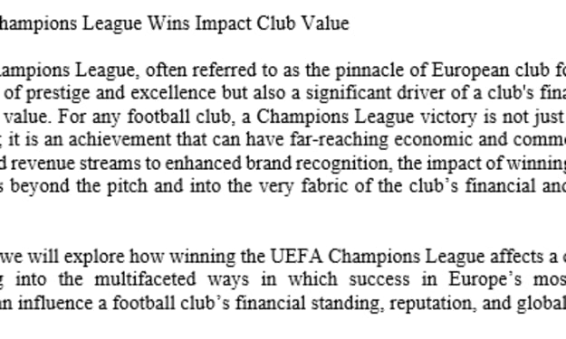 How UEFA Champions League Wins Impact Club Value The UEFA Champions League, often referred to as the pinnacle of European club football, is not only a symbol of prestige and excellence but also a significant driver of a club's financial growth and long-term value. For any football club, a Champions League victory is not just a moment of sporting glory; it is an achievement that can have far-reaching economic and commercial effects. From increased revenue streams to enhanced brand recognition, the impact of winning this coveted trophy extends beyond the pitch and into the very fabric of the club’s financial and commercial strategy.