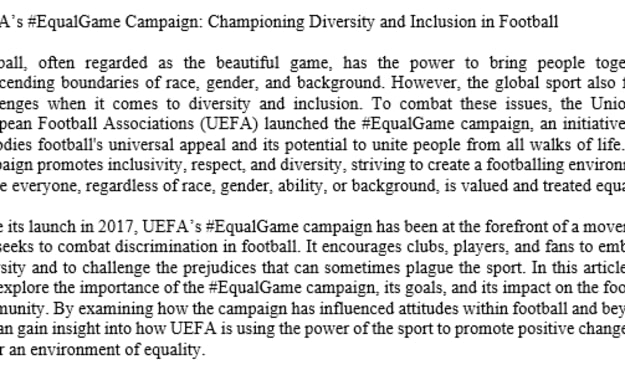 UEFA’s #EqualGame Campaign: Championing Diversity and Inclusion in Football Football, often regarded as the beautiful game, has the power to bring people together, transcending boundaries of race, gender, and background. However, the global sport also faces challenges when it comes to diversity and inclusion. To combat these issues, the Union of European Football Associations (UEFA) launched the #EqualGame campaign, an initiative that embodies football's universal appeal and its potential to unite people from all walks of life. The campaign promotes inclusivity, respect, and diversity, striving to create a footballing environment where everyone, regardless of race, gender, ability, or background, is valued and treated equally.