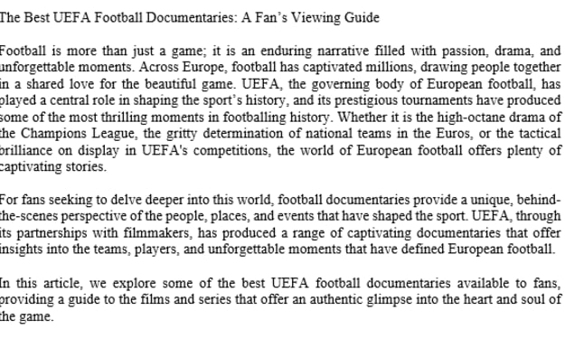 The Best UEFA Football Documentaries: A Fan’s Viewing Guide Football is more than just a game; it is an enduring narrative filled with passion, drama, and unforgettable moments. Across Europe, football has captivated millions, drawing people together in a shared love for the beautiful game. UEFA, the governing body of European football, has played a central role in shaping the sport’s history, and its prestigious tournaments have produced some of the most thrilling moments in footballing history. Whether it is the high-octane drama of the Champions League, the gritty determination of national teams in the Euros, or the tactical brilliance on display in UEFA's competitions, the world of European football offers plenty of captivating stories.