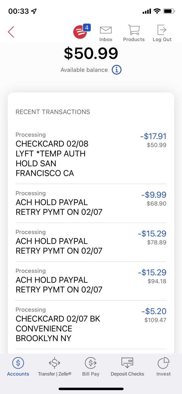 I just checked my account again...$50. "Lyft Temp Auth Hold"...my fake finance, I used my card to get us a Lyft the other night after looking at apartments, she doesn't know about my $ problems, I'm marrying her so she can get her green card, then she'll be able to get a proper gig doing interior design and she'll make bank and hopefully I'll have a better credit score after having double income for a year , my current score is 480 (fuck student debt)... I'll have to tell her. I'm out of money, secretly jobless and I have no idea how to say ... I wish I had stayed in Colorado with Kaya...