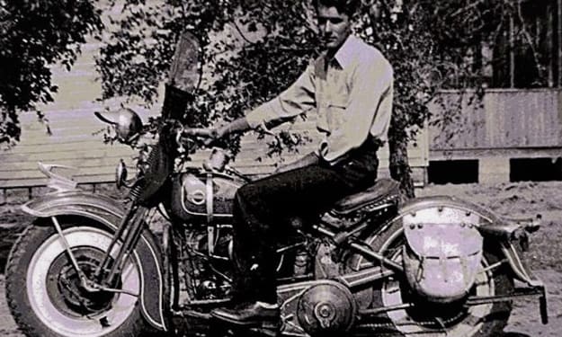Harley drives his cruiser from the lot onto the street. Two jacked-up 4x4 pick-ups follow.