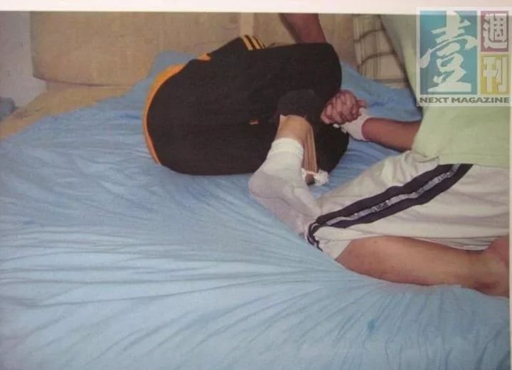 The photo shows a man wearing white gloves binding a girl's hands. The girl's ankles are double-bound with white rope and beige tape.