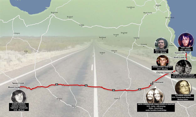 A killer is rumored to be on the desolate stretch of road where 12 people have disappeared, some found murdered earning it the nickname the Highway of Death. The Flinders Highway in Australia's state of Queensland runs for 500 miles between Townsville and Mint Isla. The highway passes through some beautiful scenery and some desolate expanses of the Australian outback.
