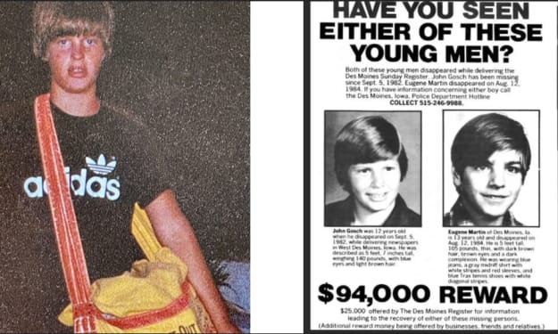 John David Gosch, born on November 12, 1969, was a paperboy in West Des Moines, Iowa, who went missing between 6 and 7 a.m. on September 5, 1982. He is believed to have been abducted. As of 2023, no arrests have been made, and the case is currently classified as cold but still open.
