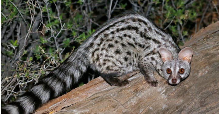 Common genets are a small species of viverrid that are native to Africa and have been introduced to the Balearic Islands and southwestern Europe. They can be seen anywhere north of the Sahara Desert in areas of dense vegetation. During the day common genets rest among thickets or in hollow trees. They come out at night to feed on small mammals, birds, lizards, and amphibians, among other food sources.