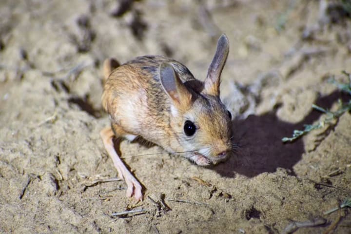 Four-toed jerboas are a species of rodents native to Libya and Egypt. They live in deserts and coastal salt marshes. These rodents have large hind legs and long tail they usde for balance. They feed at night on leaves, soft seeds, and grasses.