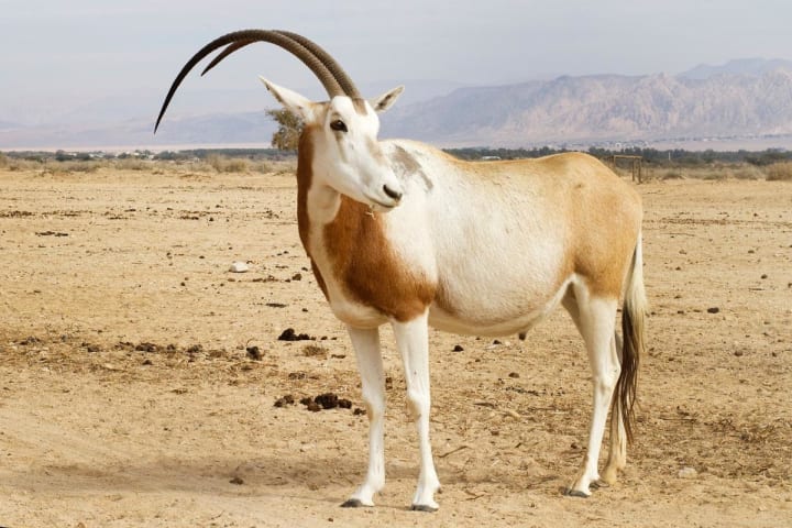 Scimitar oryxes are also referred to as Sahara oryxes. Since they were declared extinct in 2000 nore groups of them are being released back into the wild.