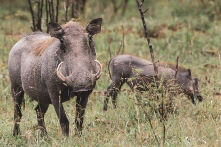 Common warthogs are a species of wild pig native to sub-Saharan Africa. These are the only pigs adapted to savanna habitats. The warthogs inhabit grasslands, savannas, and woodlands and can be found throughout all of Mozambique. They are omnivorous, feeding on grasses, insects, bark, eggs, fruits, and carrion.