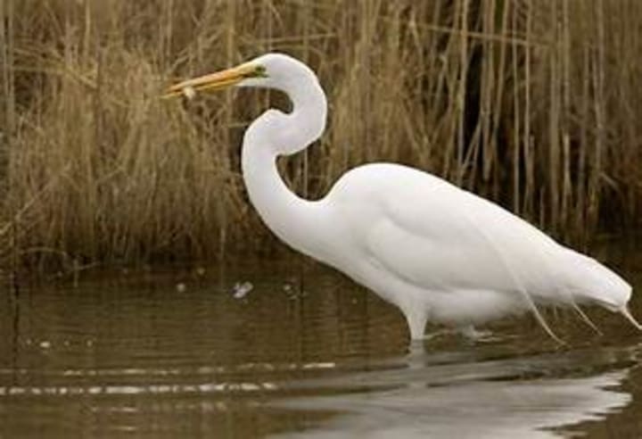 Great egrets are large, widely distributed wading birds. Like all egrets, these are members of the heron family. They are completely white with magnificent plumage, reminiscent of lace. The bill of the great egret is sharp, long, and yellow in color. The bird has long, black feet and legs. These birds are widely distributed throughout the world, including North and South America, Eurasia, Africa, and Australia. In Africa, they can be found only outside the breeding season.Great egrets are carnivores. Their usual diet consists primarily of fish. However, they can feed upon a wide variety of aquatic animals, including frogs and crustaceans. They will also consume terrestrial species such as rodents and grasshoppers.