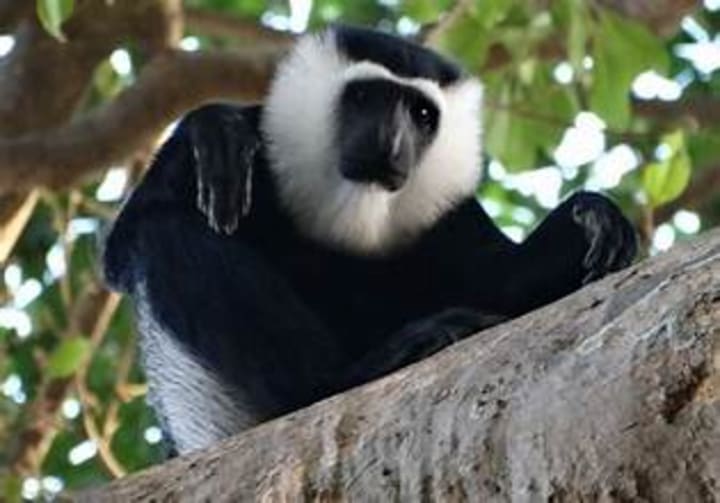 King colobus monkeys are native to West Africa. These primates are arboreal and live in groups of 3 to 4 females and 1 to 3 males with their offspring. They live in tropical mountain and lowland rainforests and feed on arboreal leaves, flowers, and fruit.