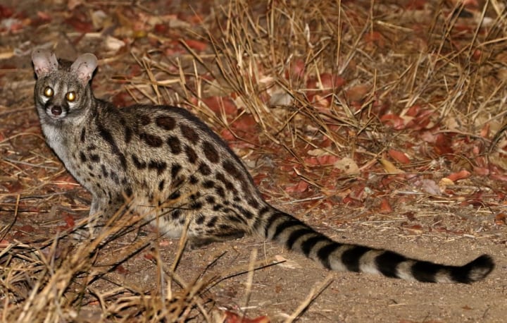 Rusty-spotted genets are small animals related to mongooses. They are nocturnal and solitary but will hunt or live in pairs. These are omnivores and dine on rodents. These mammals are semi-arboreal, meaning they spend much of their time in the trees and prefer to live in densely forested areas.