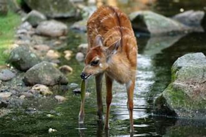 Sitatungas are semi-aquatic antelope. They inhabit swamps and have splayed feet that help them swim. They are active mainly during the early hours after dawn, the last one or two hours before dusk, and at night. They spend most of this time feeding. Sitatungas are herbivorous animals. They feed mainly on new foliage, fresh and aquatic grasses, sedges, flowers, buds, and seeds.
