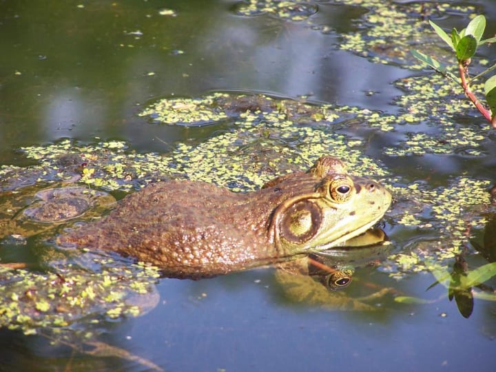 Toads and frogs living here include Hurter's spadefoot toad and southern toad, as well as frogs such as pig frog, striped chorus frog, and bronze frog. American bullfrogs are the largest frogs native to Louisiana.