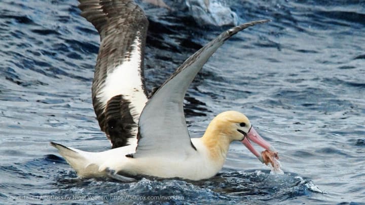 Short-tailed albatrosses are seabirds with strange, curved beaks and huge wingspans. They are categorized as vulnerable. These birds become entangled in commercial fishing nets and die as a result.