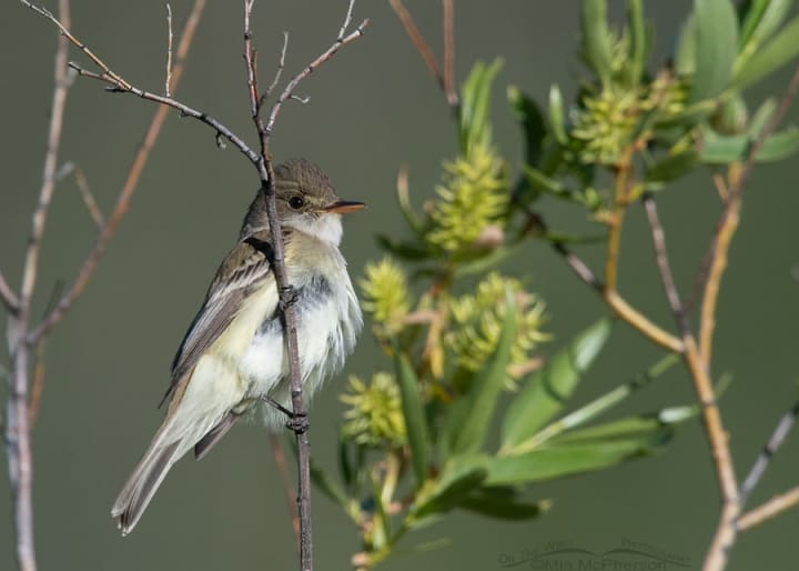 The Southwestern Willow Flycatcher is a small migratory bird with a green body. Endangered due to habitat loss and a decline of its native nesting trees. Only a few hundred breeding pairs remain in the wild.