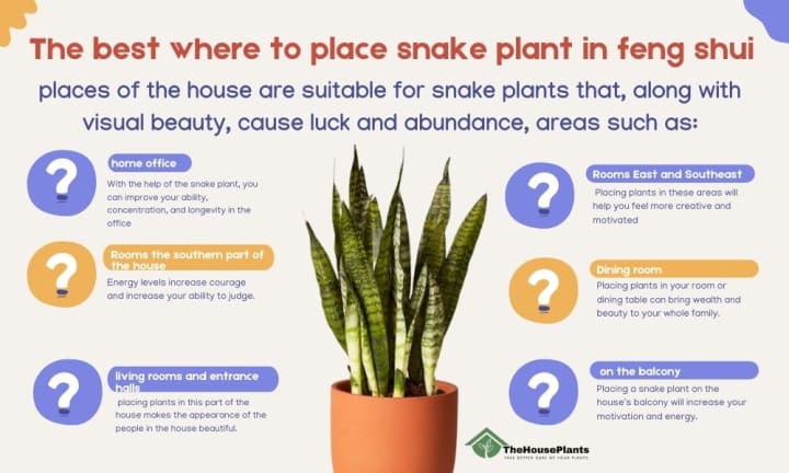 If you have a question about where to place snake plant in feng shui ? the answer should say that According to studies and the bagua energy map (which we will explain in the map below), some points in your home or office may require a boost of positive energy. Usually these places are filled with negative and sluggish energy, so some plants should be placed to neutralize this energy.