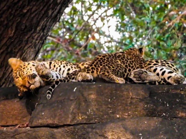 As Alberto’s video begins, a female leopard and her cub are seen on a rocky ledge. While the mother tries to settle into a comfortable position, her needy cub demands attention.
